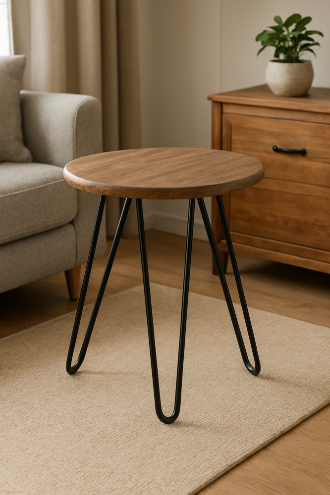طاولة أنيقة تجمع بين سطح خشبي باللون البُني الدافئ وقواعد قوية من الحديد المطلي بالستيل، مما يمنحها مزيجًا مثاليًا من الجمال والعملية.